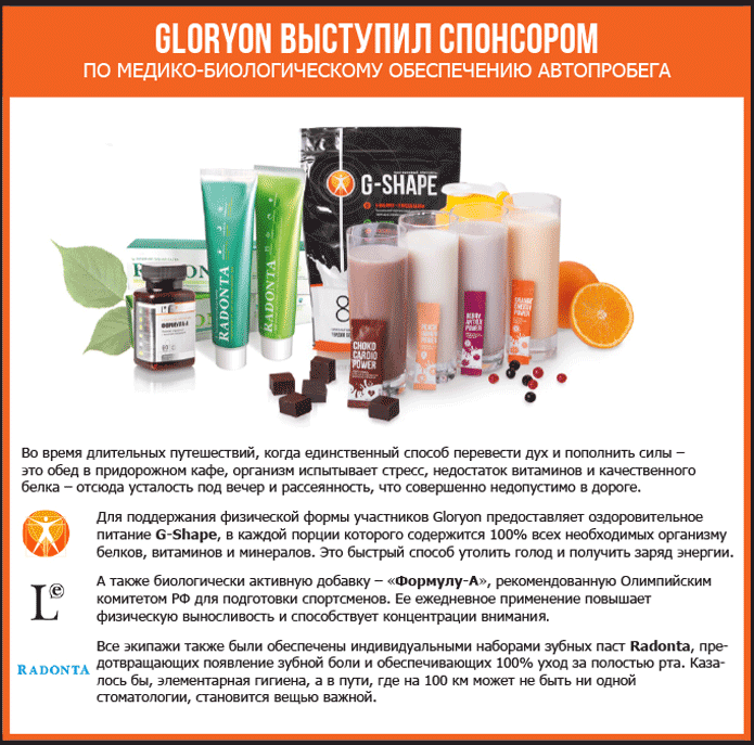 Великая Отечественная война оставила след в сердцах миллионов людей. Мы, живущие сегодня, потомки героев и наш долг – сохранить память о подвигах наших дедов и отцов, оборонявших наши города от неприятеля ценою жизни. Компания Gloryon взяла на себя миссию поддержать команду отважных путешественников, отправившихся по городам воинской славы, чтобы память о людях, отдавших жизнь во имя будущего, жила вечно! В честь Великой Победы состоялся Всероссийский автопробег «Моя Родина Россия». Маршрут проходил от Южно-Сахалинска до Севастополя через города воинской славы. Участники, среди которых были и партнеры Gloryon, преодолели более 10 тысяч километров за 55 дней. Gloron как один из партнеров Олимпийской сборной России, подготовил для участников автопробега комплекс продуктов, которые помогают поддерживать высокий уровень энергии и здоровья. Члены экипажей стали первыми, кто попробовал оздоровительное питание G-Shape и оставил отзывы.